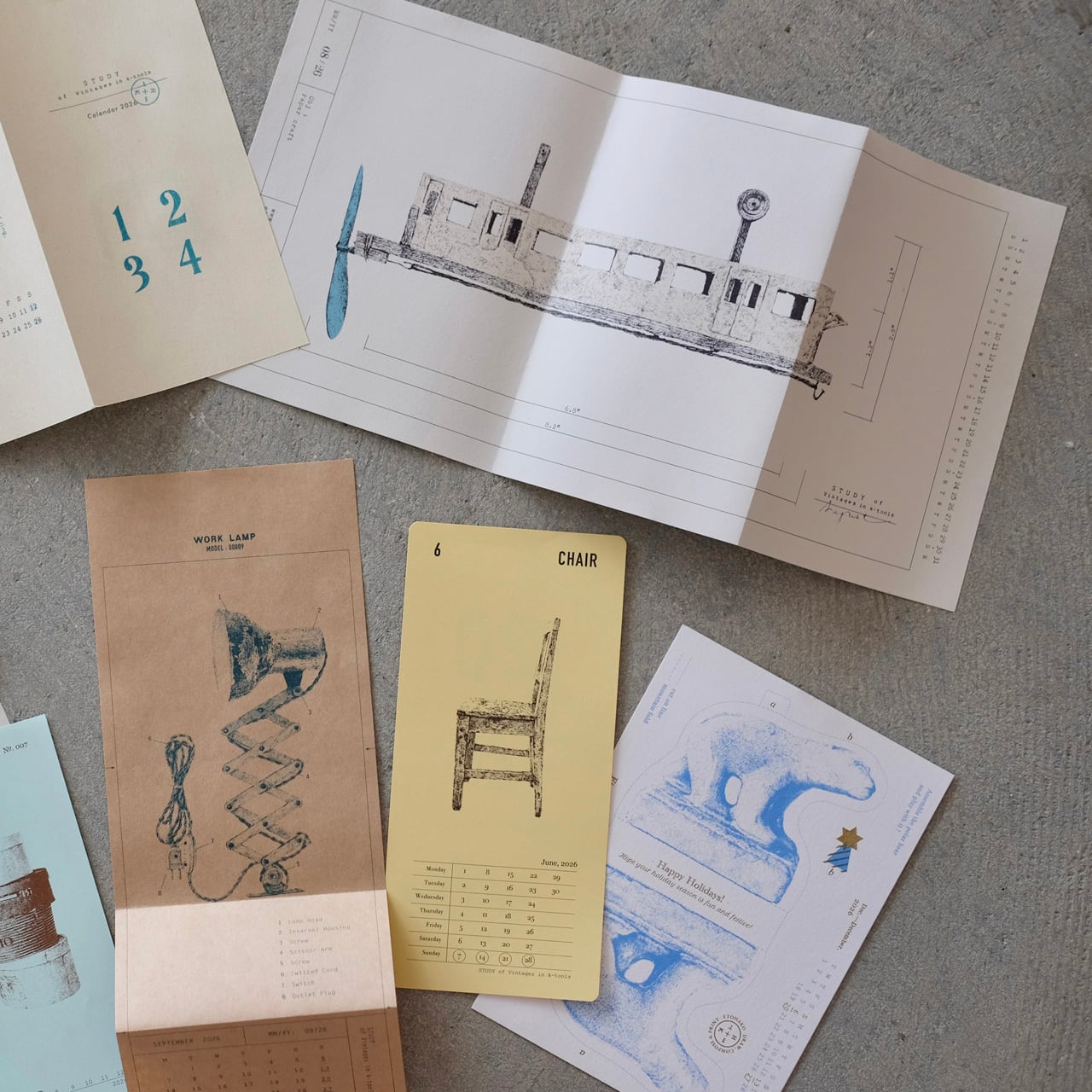 STUDYの題の通り古道具と学びをテーマとしているので、カレンダーのデザインも計算カードのようなレイアウトやルーズリーフのようなもの、設計図や博物画のようなレイアウトなど、古道具を観察したその記録集をイメージしてデザインしました。