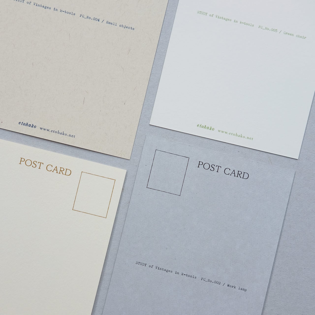 形も素材もさまざまな古道具のおもしろさをイメージした、大きさ・紙質・印刷の質感もさまざまなカード5枚セットです。