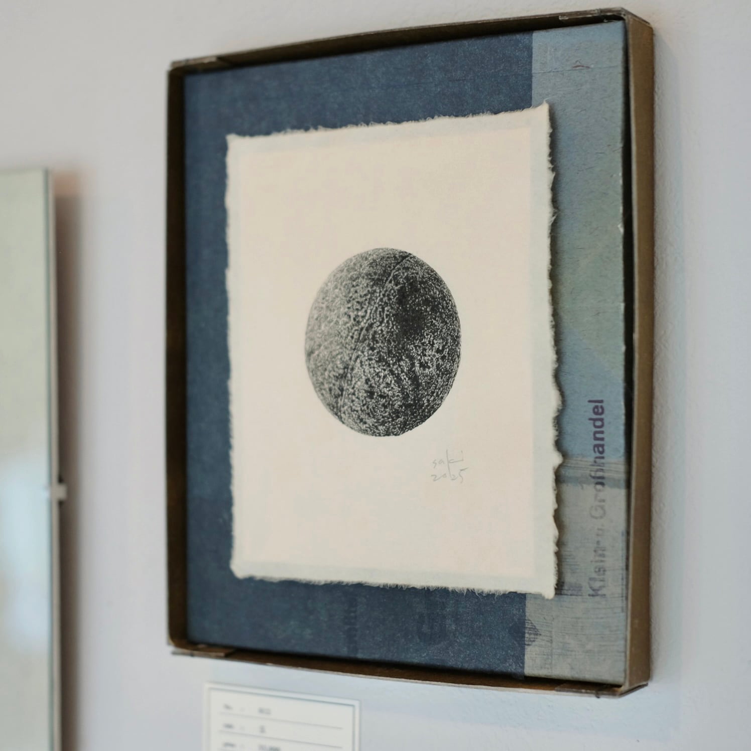 おそらく野球ボールのインナーが劣化して硬くなったものと思われる黒い玉。その姿をそのまま描き、具象画でありながらどこか抽象的な印象になるよう仕上げました。